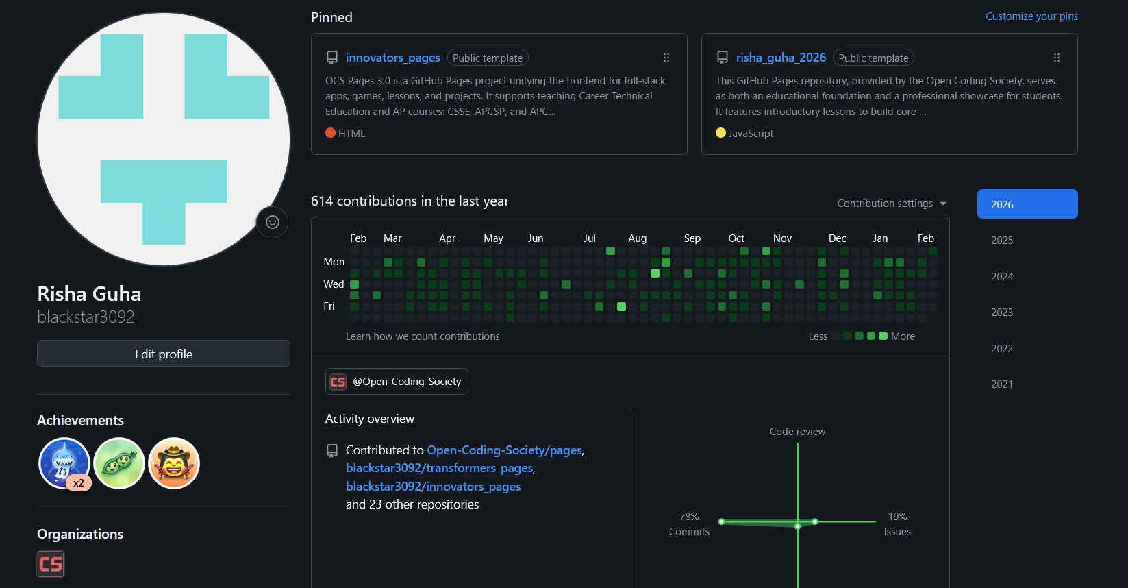 Total Commits This Year: 613 This reflects consistent contributions across Spring and GitHub Pages throughout the trimester.